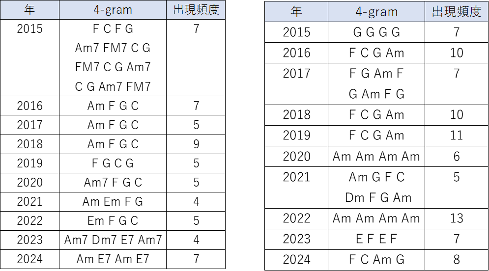最後に3つ目の分析結果として,各年の最頻出した4-gramを抽出し,コード進行の傾向を考察します.まず一番の特徴として洋楽の傾向を見ると,2015年の「G G G G」や2020年・2022年の「Am Am Am Am」のように,同一の基礎コードが4回連続で出現するパターンが複数年で見られました.また「F C G Am」のように,音楽理論において典型的で自然とされるコード進行も、複数の年を通して高頻度で登場しています.これらのことから,洋楽ではシンプルかつ典型的なコード進行が象徴的であることが分かります.一方で邦楽では,洋楽のような同一基礎コードの連続は見られませんでした.しかし,いわゆる小室進行と呼ばれる「Am F G C」のパターンが2015年から2018年,そして2020年の計5年にわたって出現頻度一位となっており,1990年代の日本のヒットソングが,現代においても依然として影響力を持ち続けていることが示唆されています.