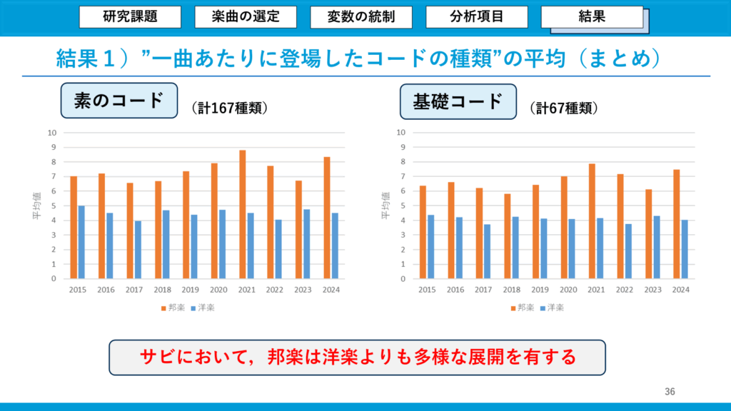 これら3つの分析結果から,邦楽は洋楽よりもサビにおけるコード進行の多様性が大きく,同じ進行の繰り返しにこだわらない傾向が分かりました.