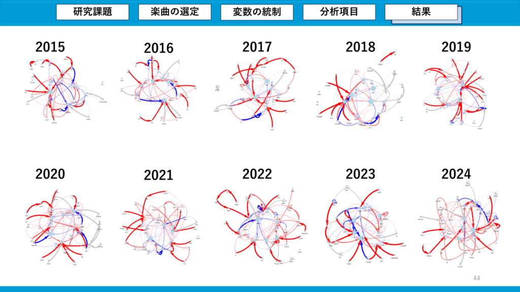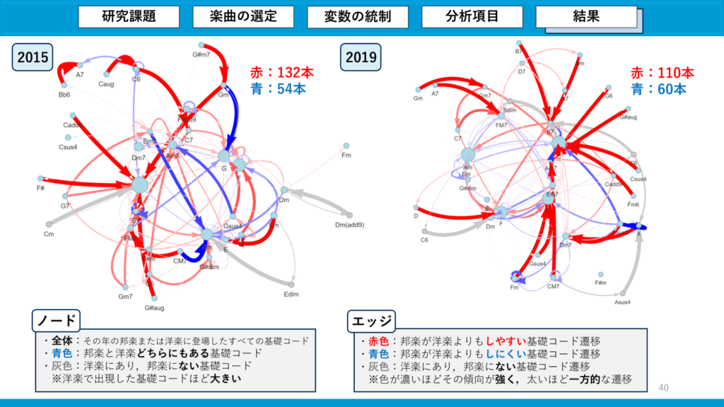 二つ目の分析結果である,一次マルコフモデルを用いた基礎コード間の遷移確率では,10年を通して邦楽のコード遷移が洋楽よりも多様であることを示しました.また,赤いエッジと青いエッジの本数をもとにした乖離度の計算では,2018年から2022年にかけては一貫して,邦楽洋楽間のサビにおけるコード遷移の多様さが縮小していることが分かりました.