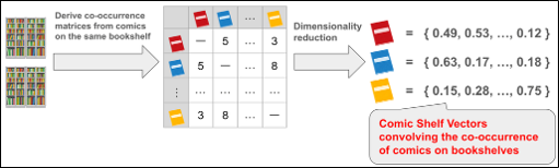 Comic-Shelf (CS) ベクトルは、読者の感性に基づいて編成された本棚データから、タイトル間の共起を畳み込むことで,漫画タイトルに対する感性を表現します。CSベクトルは以下の手順により作成します.