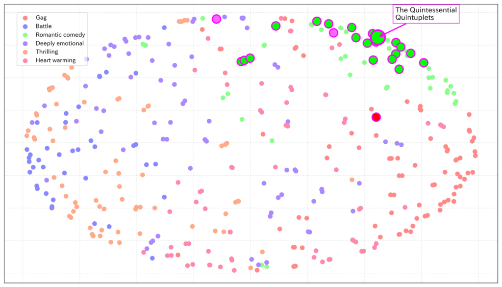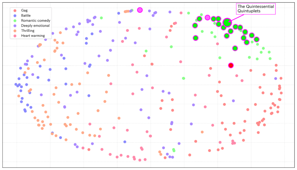 CSベクトルがどのような特徴を抽出できるかを検証するため,ComicFavesで作成された全本棚の漫画タイトルを対象にCSベクトルをマッピングしました.ランキング情報を反映したベクトルと反映していないベクトルを比較することで,感性表現におけるランキングの影響を分析しました. 分析の結果,ランキングの反映有無にかかわらず,同じ本棚に含まれるタイトルは互いに比較的近い位置にプロットされることが確認されました.これは,ベクトル類似度が高いタイトルほど,人間の主観的な感性においてもより類似していることを示唆しています.また,個々のタイトル間の類似性に加えて,本棚のテーマ間の関係性も視覚的に確認されました.一方で,ランキングの重みを反映したベクトルと反映しないベクトルで,最も類似するタイトルのペアが異なるなど,詳細な分析において異なる傾向が見られました.
